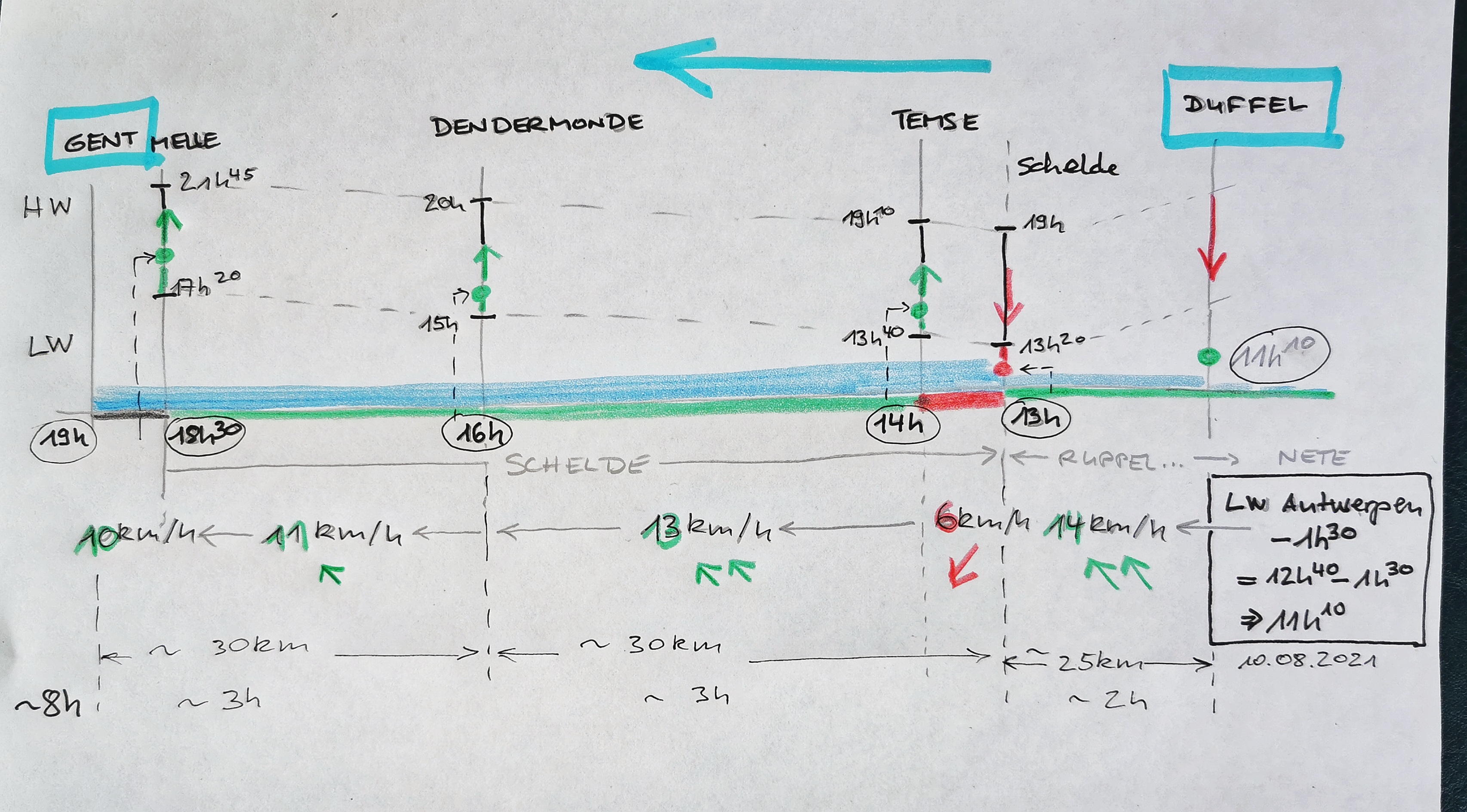 60 km, also der grösste Teil des Weges sind auf der Schelde zurückzulegen. Daher muss vor allem dieser Gezeitenstrom berücksichtigt werden. Abgesehen von der Eigenströmung des Flusses, welche zur Zeit wegen der vielen Regenfälle höher ist, kann man von einer Gezeitenströmung von etwa 5km/h ausgehen. Auf der Rupel ist zu beachten, dass sie bei Niedrigwasser überhaupt nicht befahrbar ist!