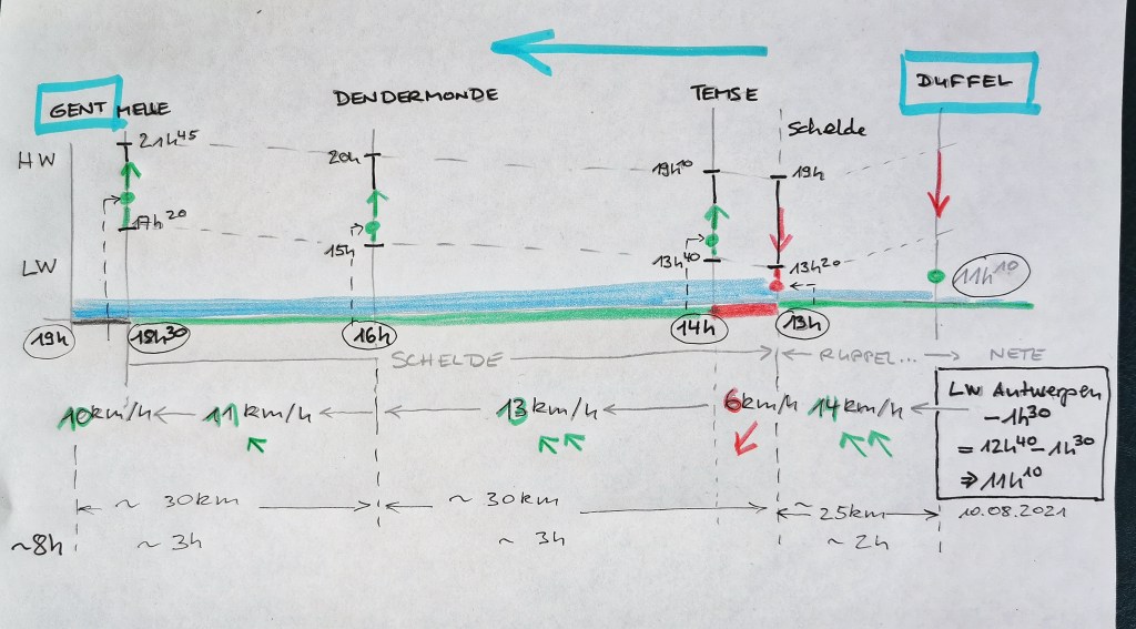 Da wir etwas „früh“ auf der Schelde ankommen, finden wir zunächst eine Gegenströmung, da das Wasser noch zurückläuft. Anders gesagt, die natürliche Strömung des Flusses und der Gezeitenstrom addieren sich: 10 – (2+5) = 3km/h . Da die Stärke des Gezeitenstroms aber am Anfang und Ende des Zyklus geringer wird, liegt der wert eher bei 2 – 3 km/h. Also kommen wir am Anfang mit etwa 6km/h voran.