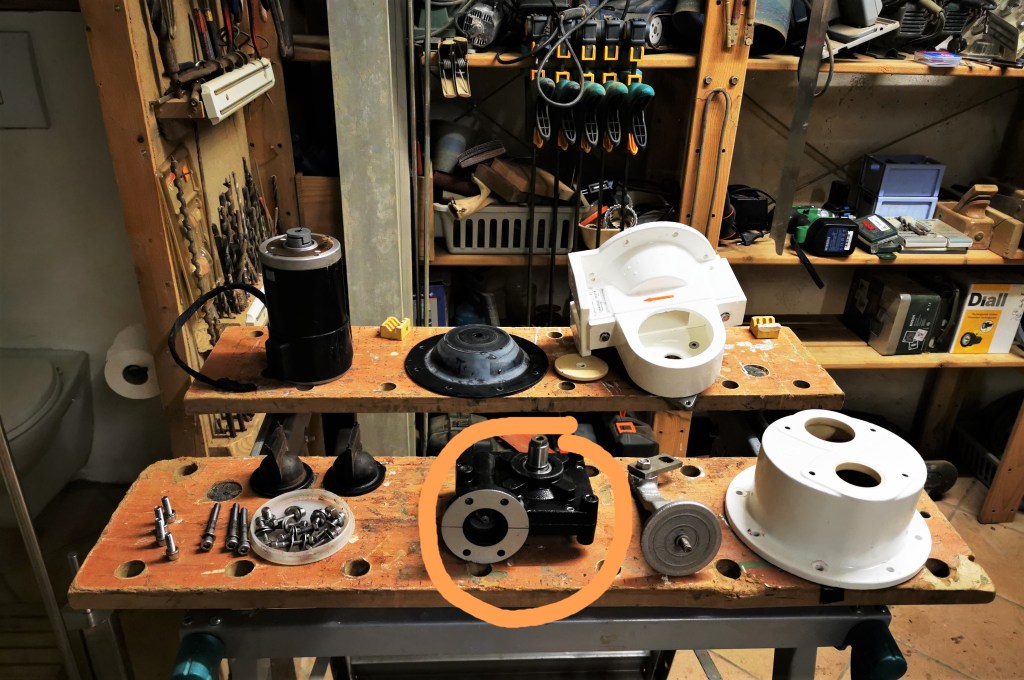 Zuhause angekommen, war es jetzt an der Zeit der Ursache nachzugehen…. Also wurde die Pumpe in ihre Einzelteile zerlegt. Als erstes fiel auf, dass die Membrane zwar Gebrauchtspuren aufwies (seit 2014 im Einsatz), aber noch voll funktionstüchtig war. Nachdem alle Teile auf dem Tisch lagen, wurde schnell klar, dass das Getriebe „festgefahren“ war. In der Gebrauchsanweisung wird darauf hingewiesen, dass die Pumpe bis zu 20 Ltr. / Minute pumpt. Unser Fäkalientank fasst 220 Liter…. also im Extremfall 11 Minuten!!!