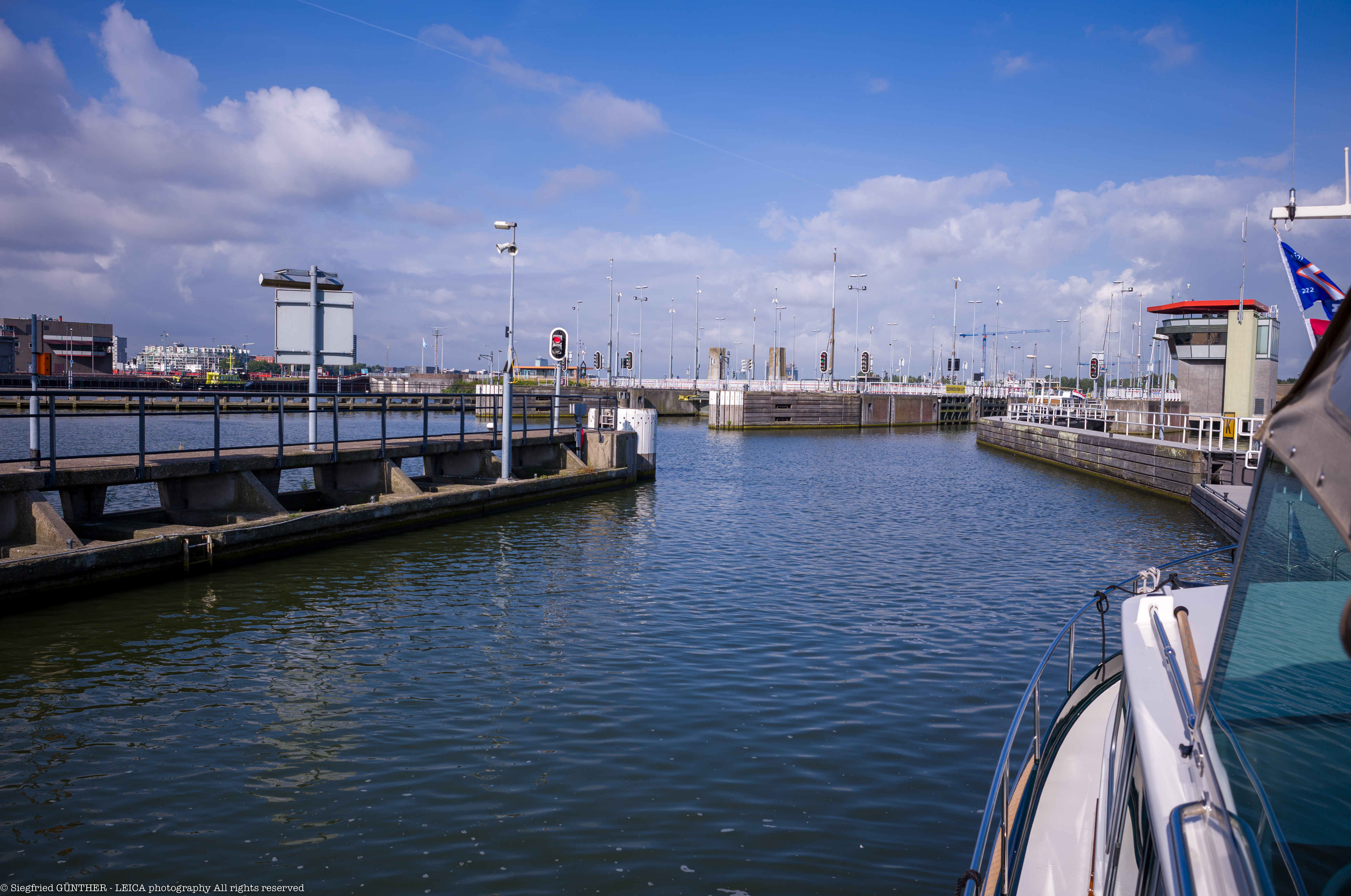 Sportboote werden in der „Nord“-Schleuse geschleust. Als wir die Kammer erreichen, fahren gerade eine beachtliche Anzahl von Segelschiffen heraus in Richtung Markermeer. Bis zum Siwhafven brauchen wir noch eine Stunde. Da wir nicht angerufen haben, (was zu empfehlen ist!) kommt uns der Hafenmeister entgegengelaufen, um uns einen „passenden“ Platz zuzuweisen. Wie immer ist viel Bewegung im Hafen. Was uns diesmal überrascht ist die deutliche Überzahl der Segelyachten. Die ankommenden Motorboote sind meistens gechartert. Zum Thema „Chartern“ noch eine kurze Bemerkung: Es ist völlig unverständlich, dass die Chartergesellschaften ihren Kunden nicht ein Minimum an Einweisung zu geben scheinen. Der Umgang mit den Festmachern, den Leinen und Klampen, steht wohl eindeutig nicht auf dem Programm.