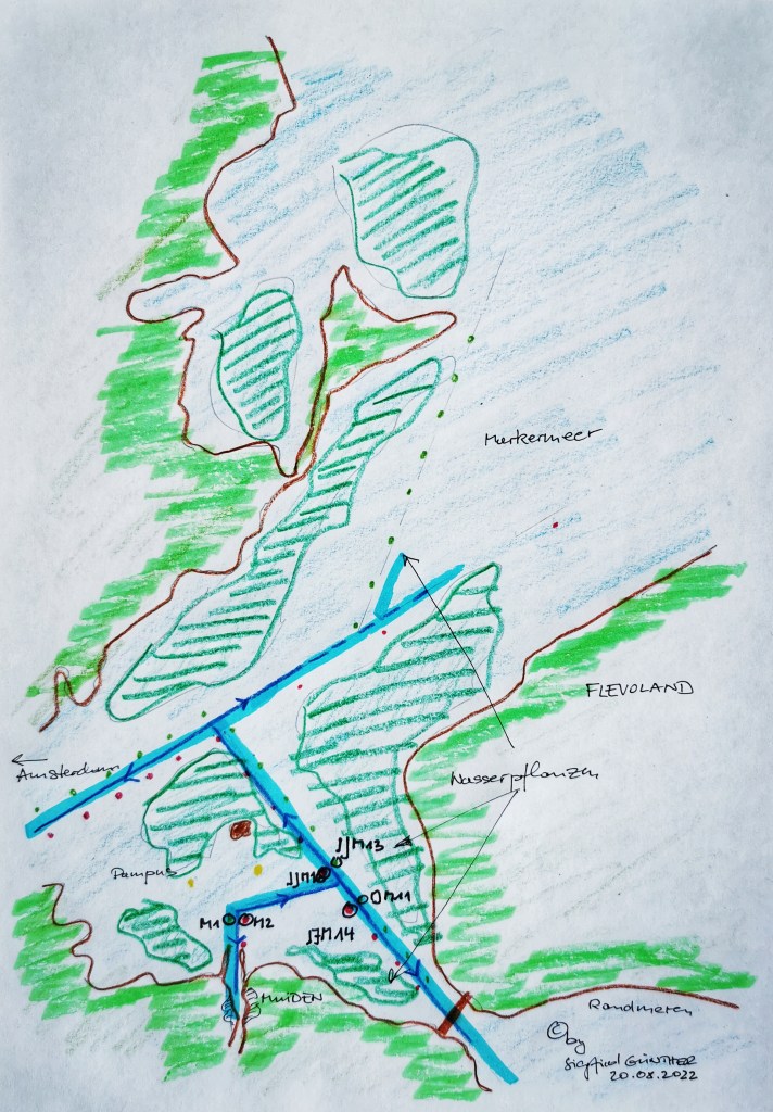 Die Route ist zunächst nicht betonnt und führt durch recht tiefes Fahrwasser. Da inzwischen keine Fischernetze in Sicht sind und kein Fischerboot hier kreuzt, ist diese Route recht sicher und wie sich herausstellt, frei von Wasserpflanzen. Zwischen den Bojen IJM14 und IJM16 biegen wir nach Backbord ab und folgen der Fahrrinne. Inzwischen hat der Wind aus Süd-Westen kräftig aufgefrischt . Die Wellen kommen jetzt von der Seite, was das Boot etwas zum Rollen bringt. Inzwischen sehen wir solche Umstände gelassener. Was nicht bedeuten soll, dass man auf offenem Wasser diese Gegebenheiten auf die leichte Schulter nehmen sollte. Nach einer Stunde erreichen wir die Fahrrinne Amsterdam <> Lelystad. Jetzt kommen die Wellen von vorne, was die Fahrt ruhiger werden lässt.
