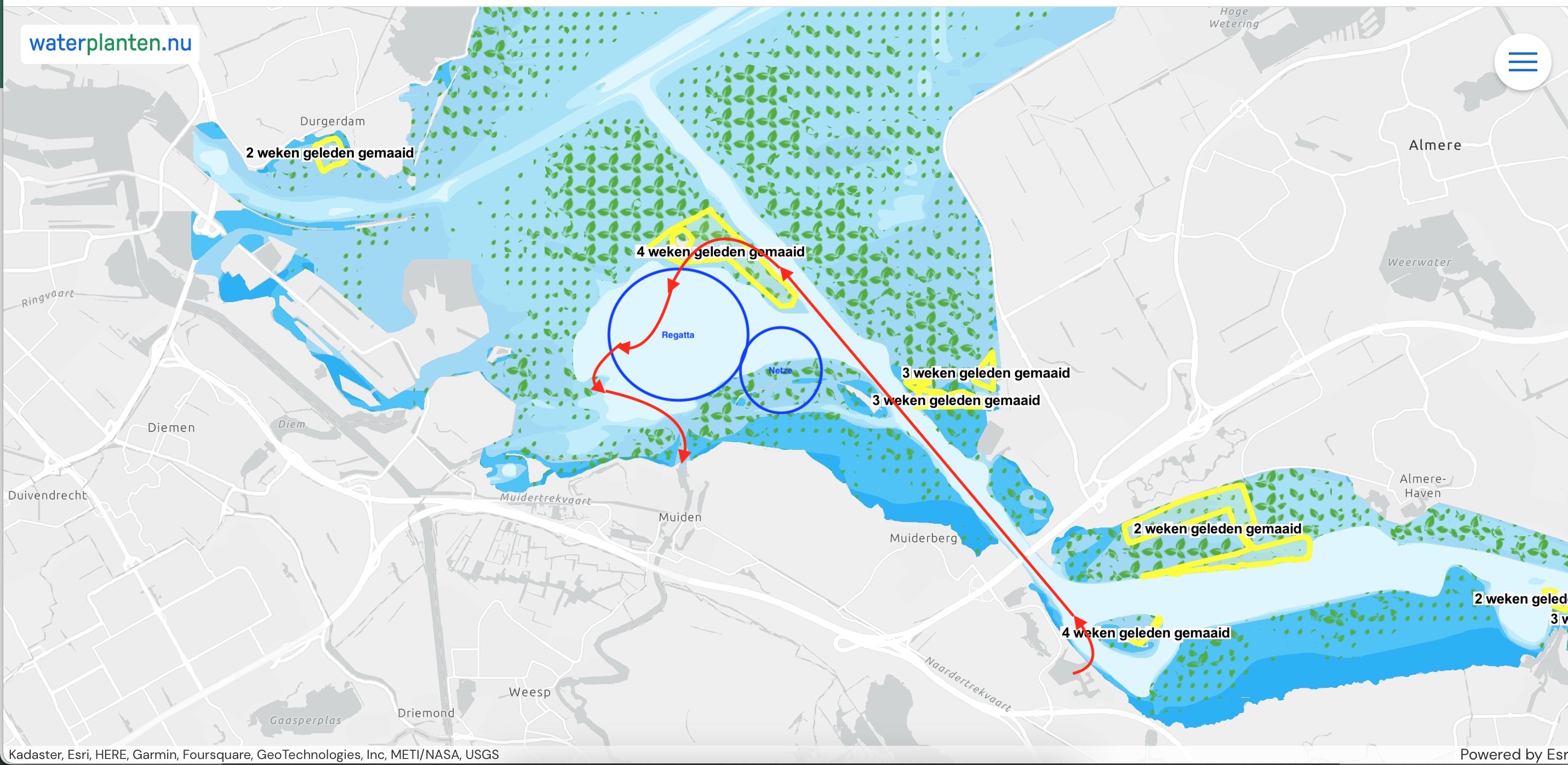 Nach 7 Tagen brechen wir nach Muiden auf. Zunächst bleiben wir in der Fahrrinne. Vor der Fahrt haben wir uns über die Lage der Wasserpflanzen informiert. Seit 2019 hat der Befall stark zugenommen. Damals war vor allem die Küstenregion um die Stadt Hoorn stark betroffen. Um sich ein genaueres Bild zu machen, ist die Application waterplanten.nu sehr hilfreich.