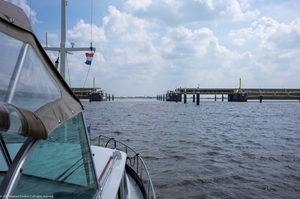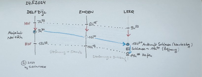 Nach einem Gespräch mit zwei niederländischen Yachten im Hafen von Delfzijl entscheiden wir uns, bis nach Leer zu fahren. Für die Strecke sehen wir 4h vor. Die See-Schleuse bei Leer wird drei Mal am Tag bedient: 8h, 14h und 17h30. Eine Schleusung um 14h sollte möglich sein.