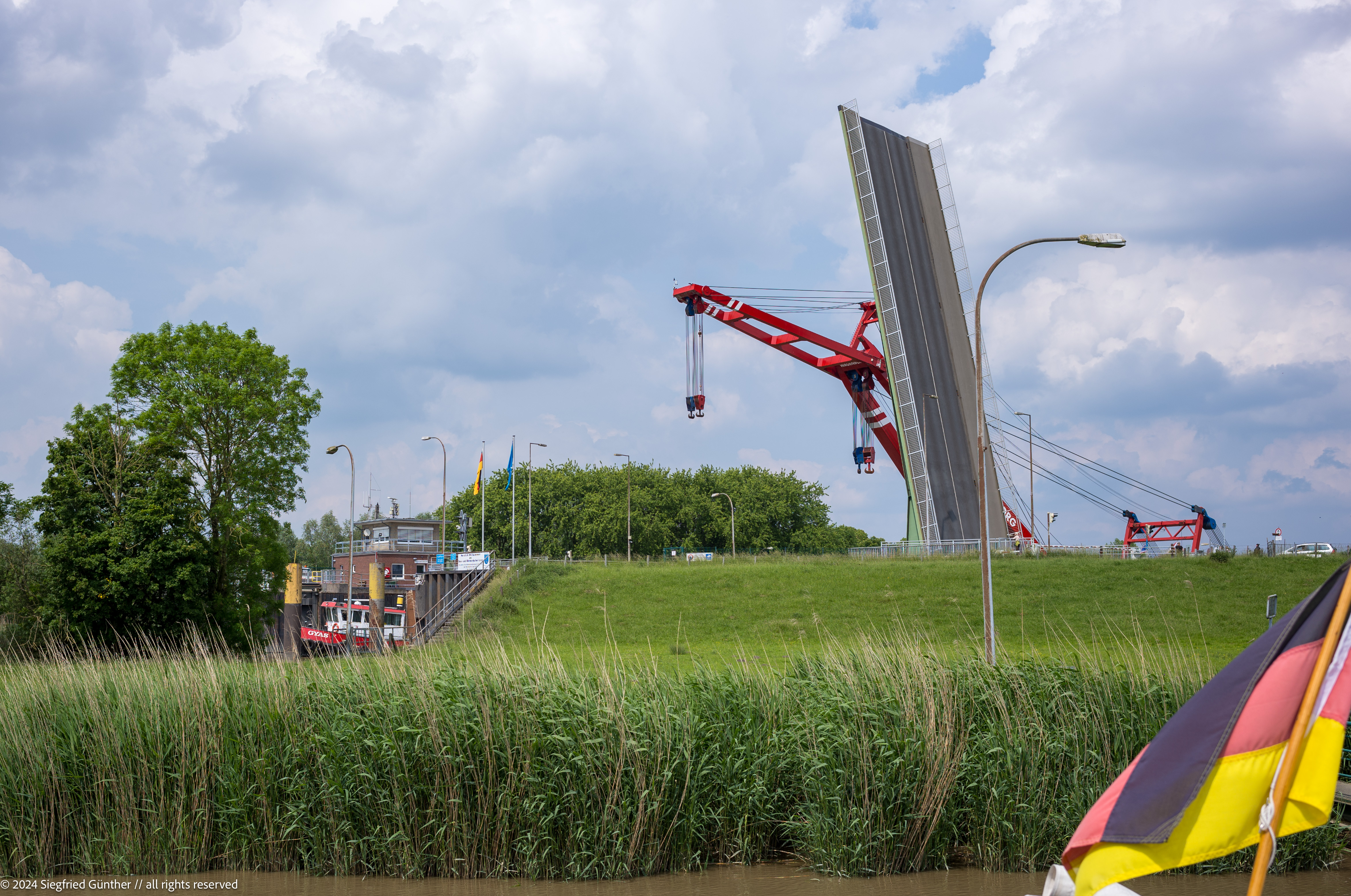 Als wir gegen 13h20 nach 35km uns Leer nähern, finden wir die Zwei und eine deutsche Yacht am Wartesteg auf der Leda. Der Steg bietet Platz für 3 Boote (3 x 12 m). Für uns bleibt der „Doppel-Pack“ mit einem kleinen deutschen Boot. Wegen der starken Strömungen hier (Leda, Ems und Tiede), gehen wir das Manöver vorsichtig an. Wir warten noch fast eine Stunde, bis wir in die Schleuse einfahren können. Vorrang haben die ausfahrenden Schiffe, heute sogar ein grosser Schwimmkran, der von einem Schlepper gezogen wird.