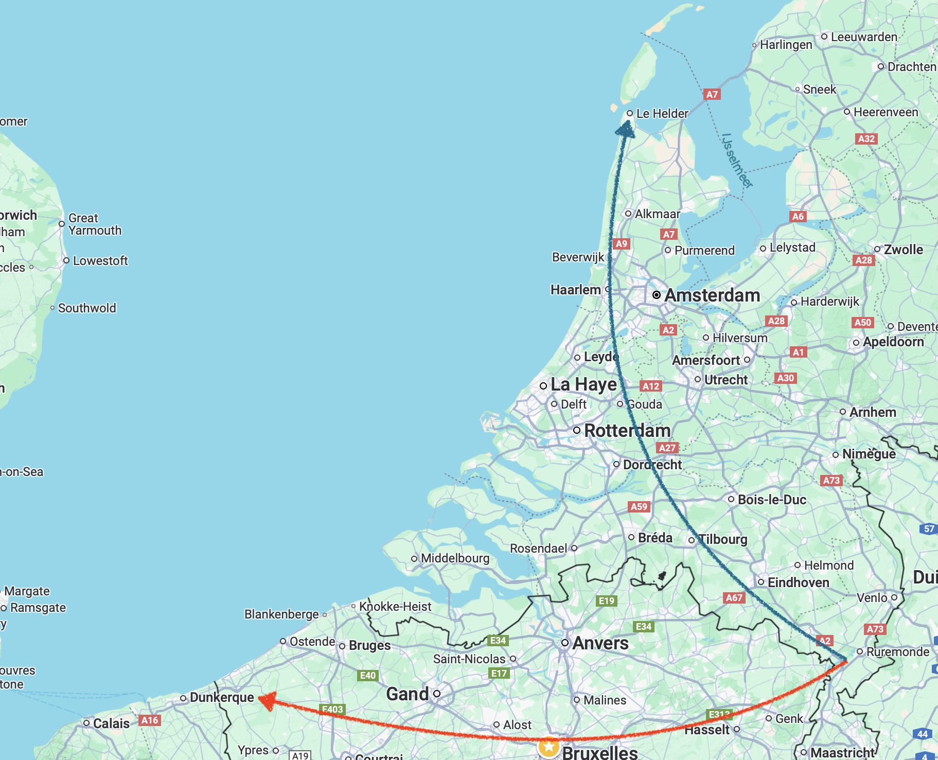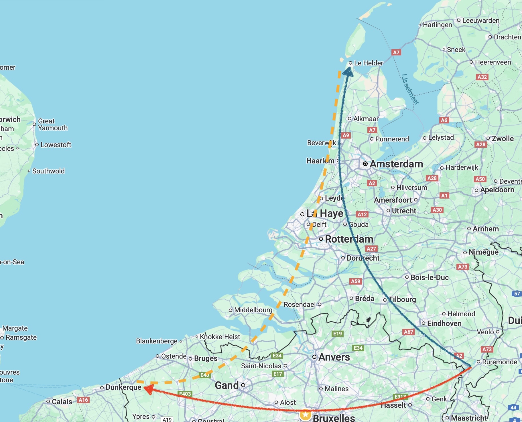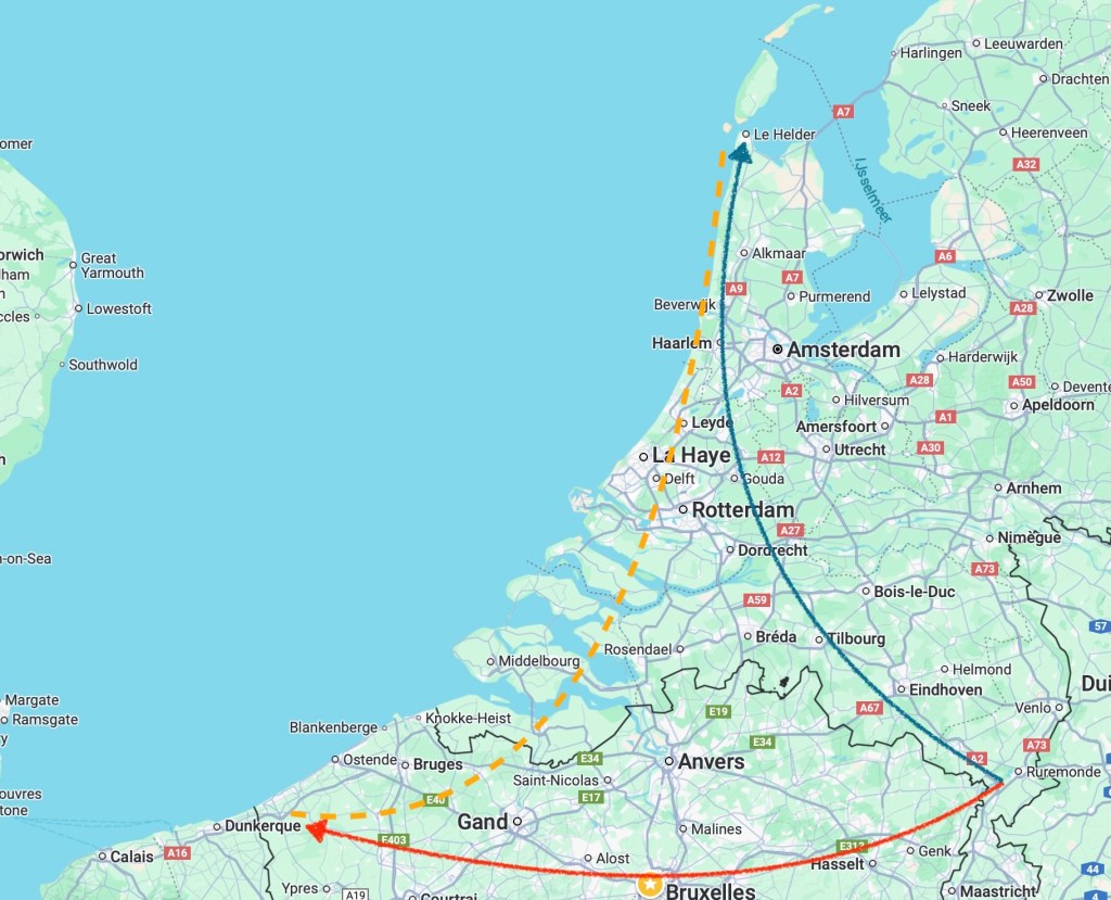 • Welche Strecke wählen wir, um nach Nord-Frankreich zu kommen: über Belgien oder über Zeeland ? Beide Varianten bieten noch viele Möglichkeiten.