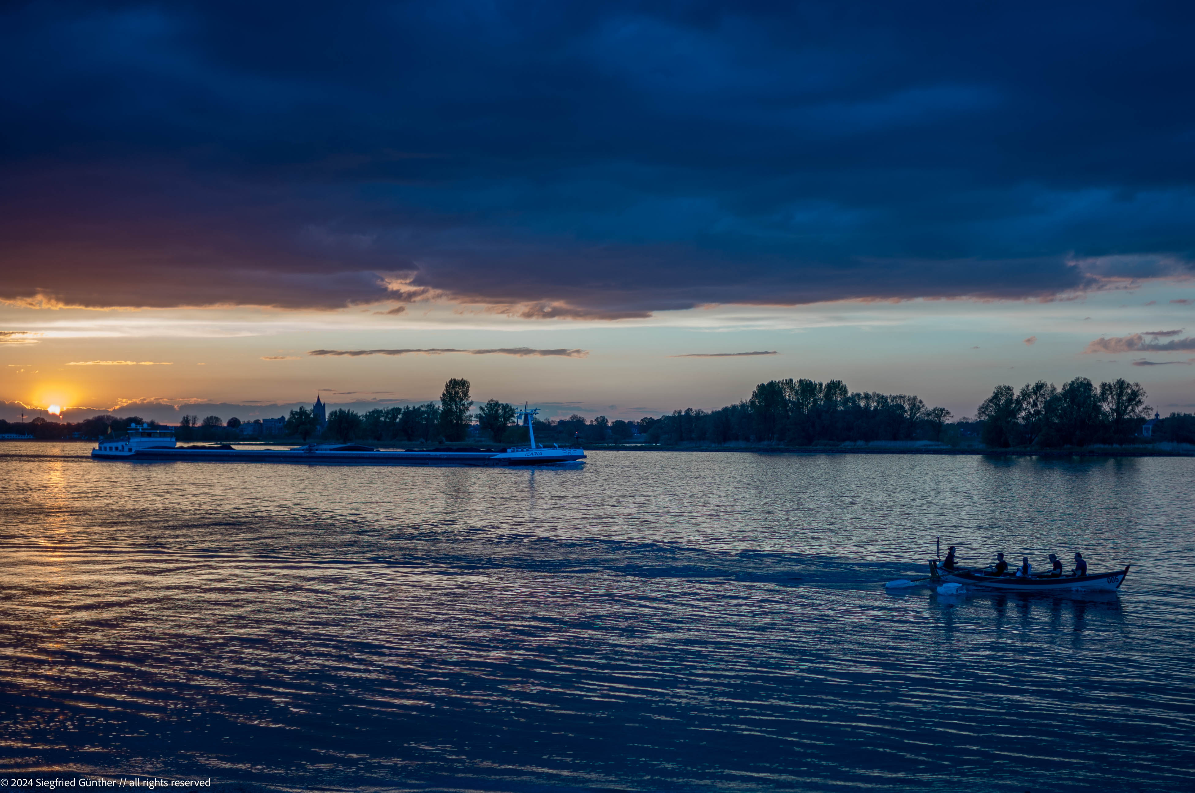 Natürlich führt uns ein Spaziergang zum Waal. Es ist erstaunlich wenig Verkehr an diesem Nachmittag. Als wir dann kurz vor Sonnenuntergang wieder ans Ufer gehen, erleben wir eine lustige Szene. Man hat den Eindruck, dass ein kleines Ruderboot mit einem Frachter um die Wette gegen die Strömung ankämpft.