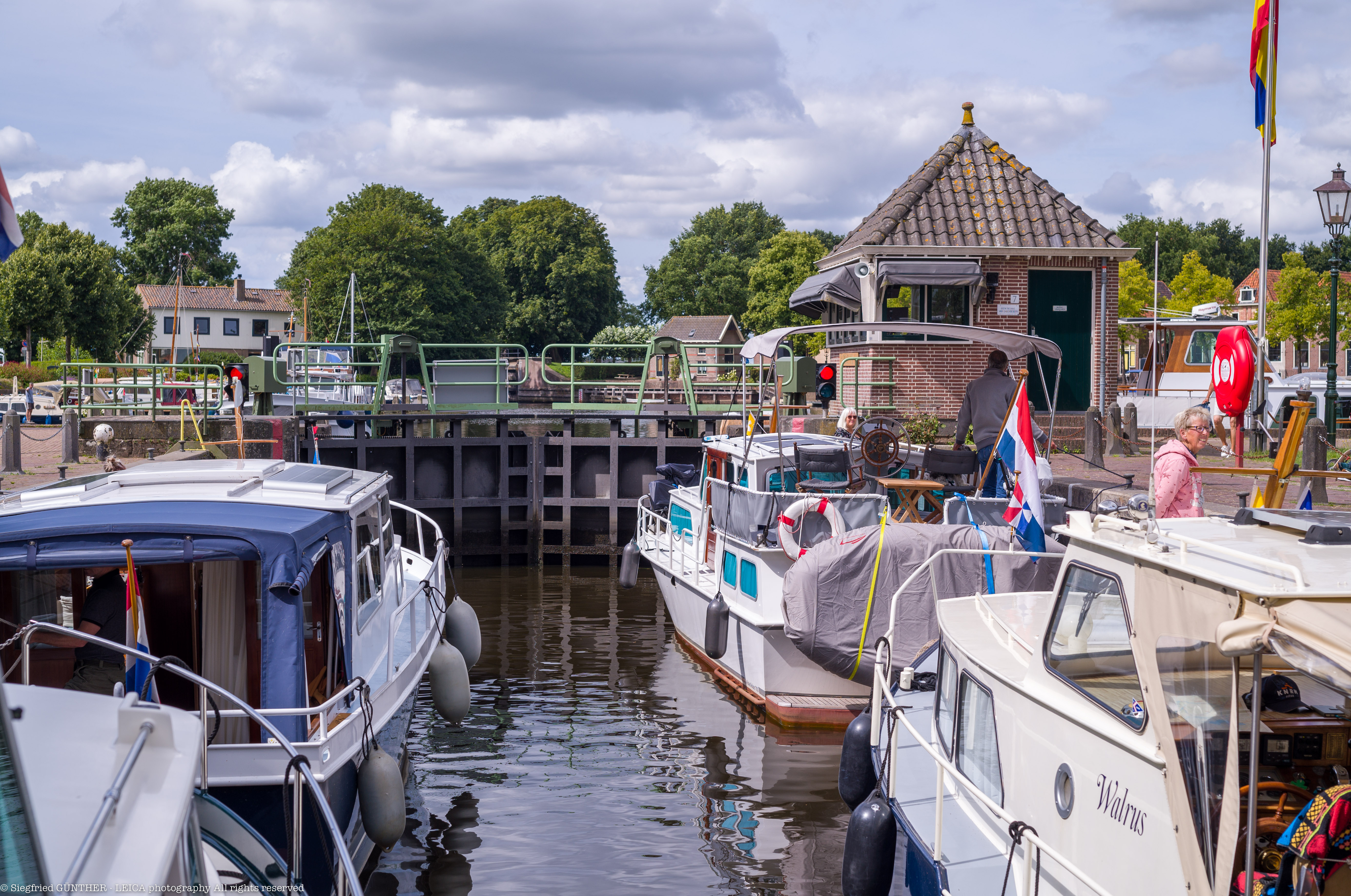 Der Bootsverkehr hat zwar im allgemeinen etwas abgenommen, aber je mehr wir uns Blokzijl nähern, um so dichter wird er wieder. An der Schleuse angekommen, müssen wir erst eine Schleusung abwarten, bevor wir mit 4 anderen Schiffen an der Reihe sind.