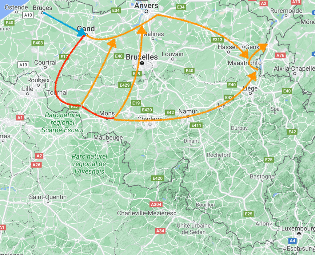 Aus der Gezeitentabelle erfahren wir, daß an unserem geplanten Reisetag um 6h33 Hochwasser in Antwerpen ist. 3h30 braucht es bis zur Gezeitenschleuse in Gent. Dann ist dort der Hochwasserpegel bei 4,83m. Wenn wir also von der zurücklaufenden Flut voll profitieren wollen, müssen wir gegen 10h00 losfahren (allerdings dauert es etwa 1 Stunde bis die Strömung beim Rückfluss spürbar wird. Um 13h30 ist wieder Niedrigwasser in Antwerpen und die nächste Flute beginnt schon. Anders ausgedrückt, um ausschließlich von der Flut profitieren zu können, müsste man in Antwerpen vor 13h30 ankommen, also nach 3 ein halb Fahrstunden mit mehr als 22km/h Geschwindigkeit,… was in unserem Fall nicht realistisch erscheint. So muß man sich darauf einstellen, jeweils einen Teil der Strecke mit und gegen die Strömung zu fahren…