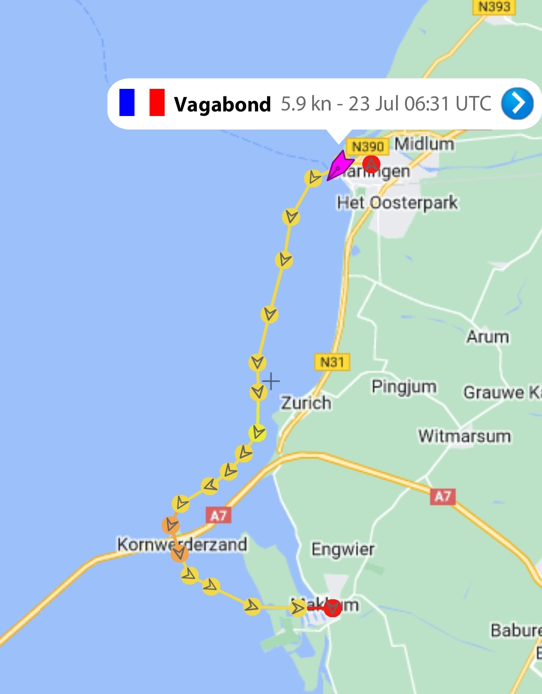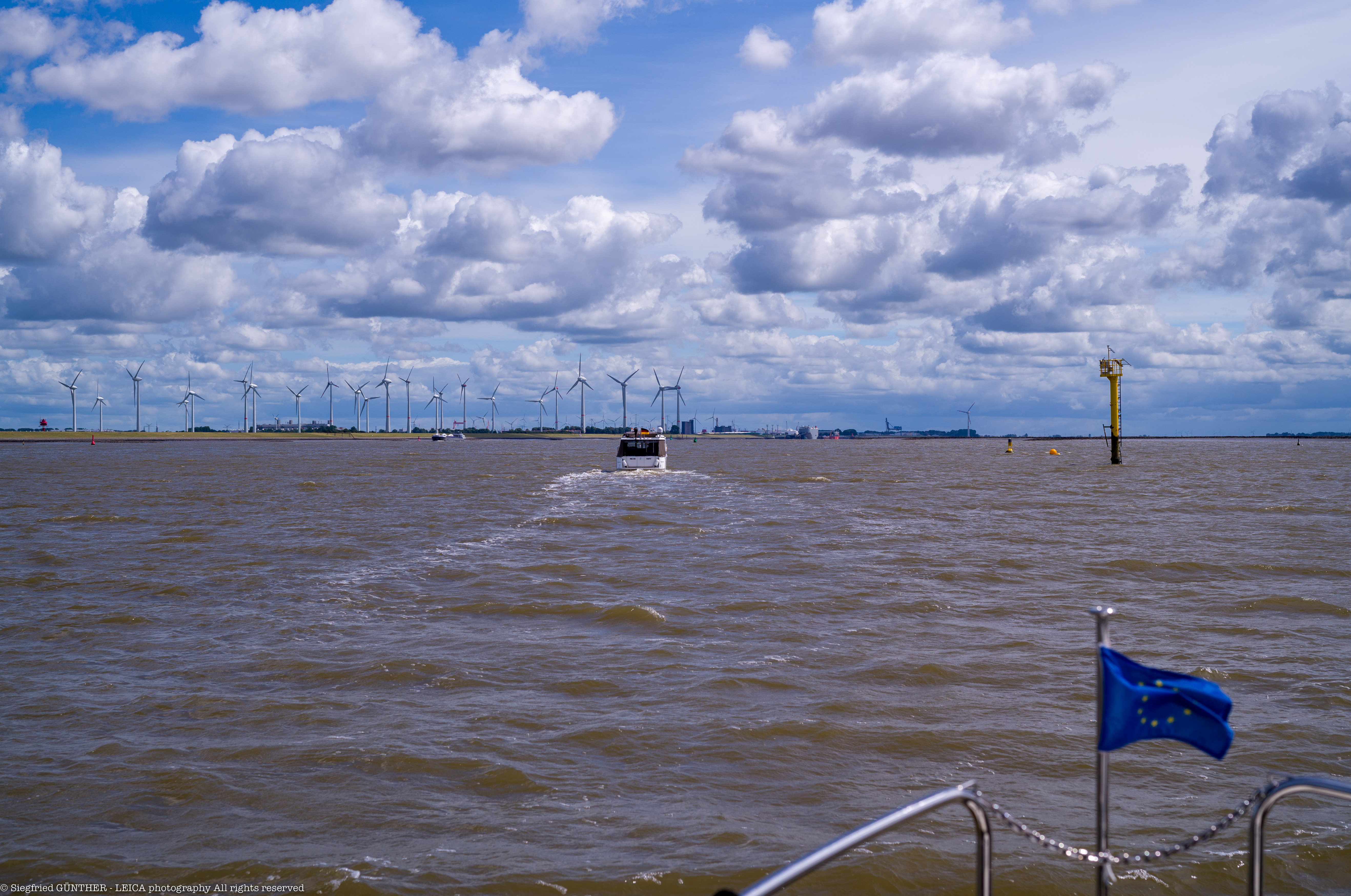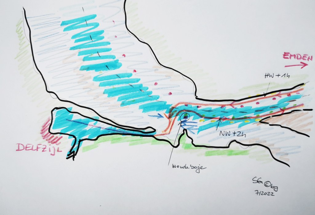 Wir fahren im Konvoi mir EPSILON, welche die Verkehrszentrale per Funk über unsere gemeinsame Fahrtrichtung informiert. Bis zur Einfahrt in den Dorsdte Kil fahren wir mit unserer üblichen Reisegewindigkeit. „SOG“ und Geschwindigkeit im Wasser liegen bei 10km/h.