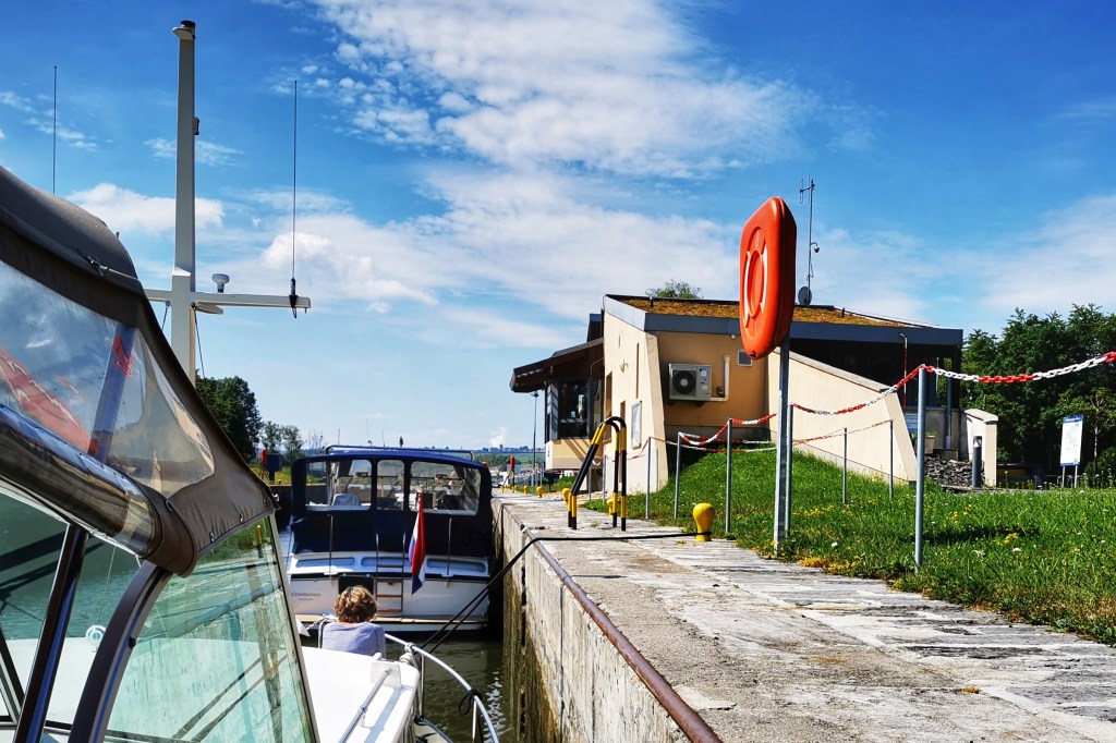 Aus den Niederlanden über die Maas kommend, überwindet ma das erste Nadelöhr in Lanaye an der Schleuse. Längere Wartezeiten sind die Regel!!