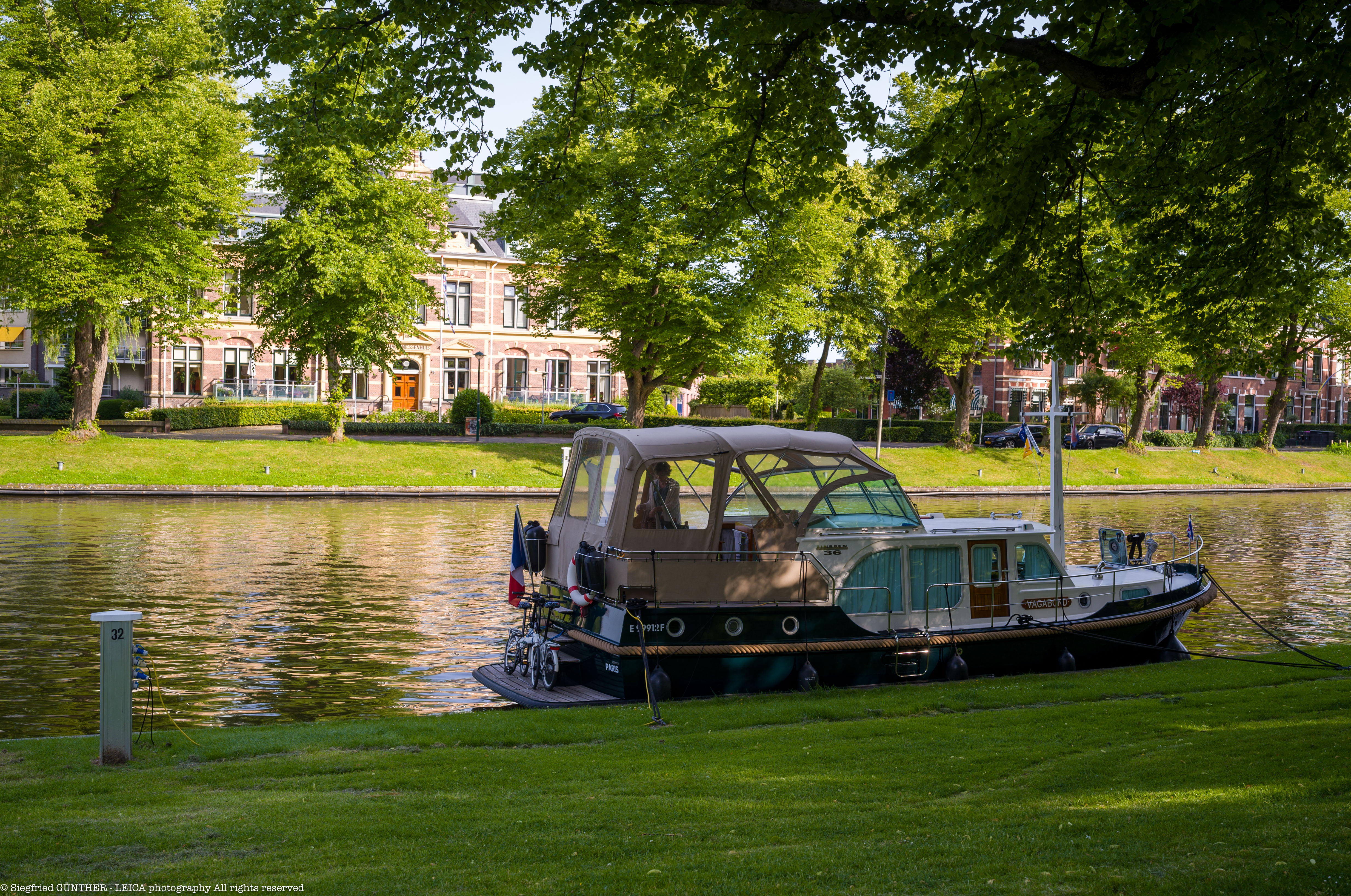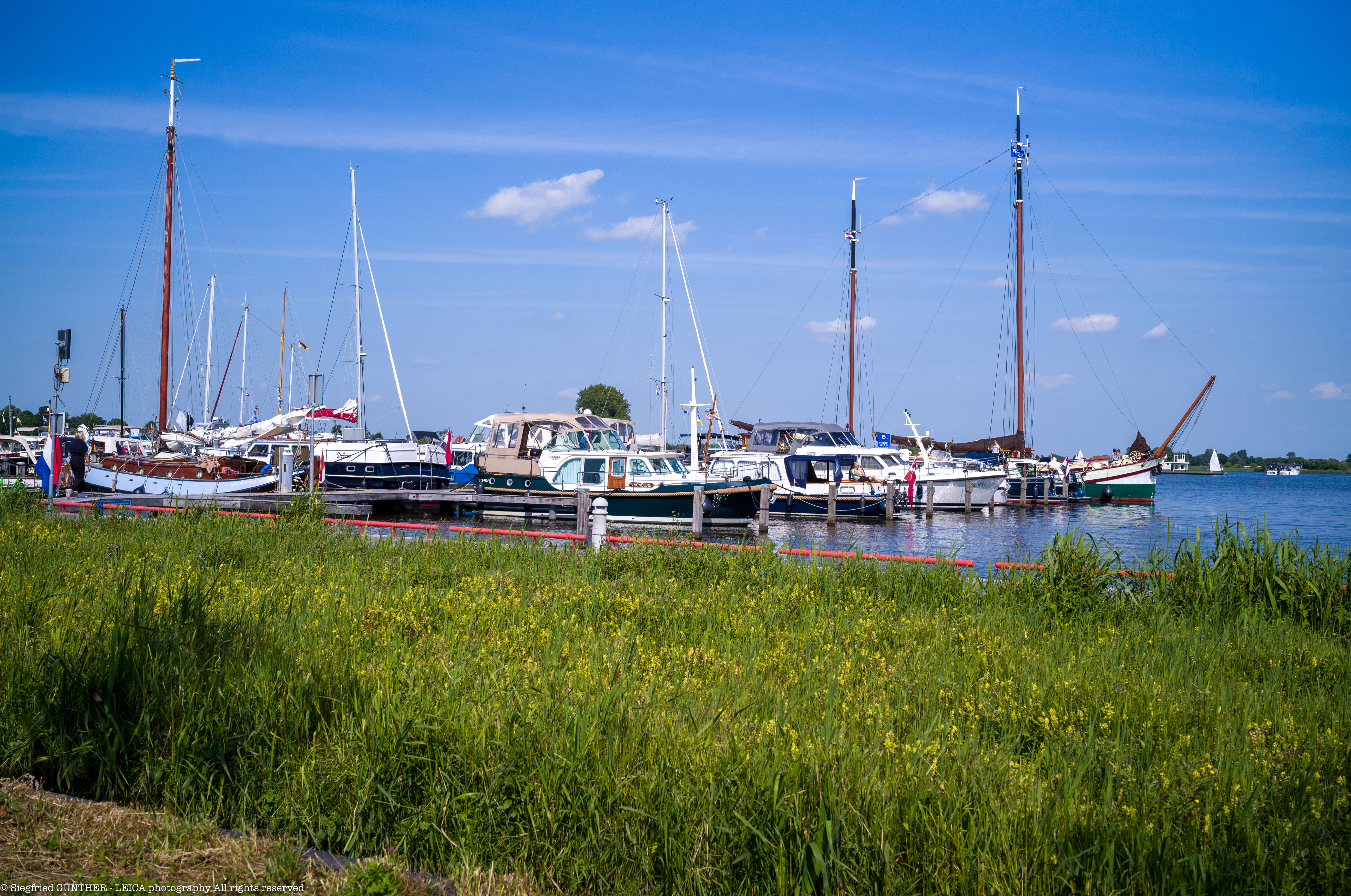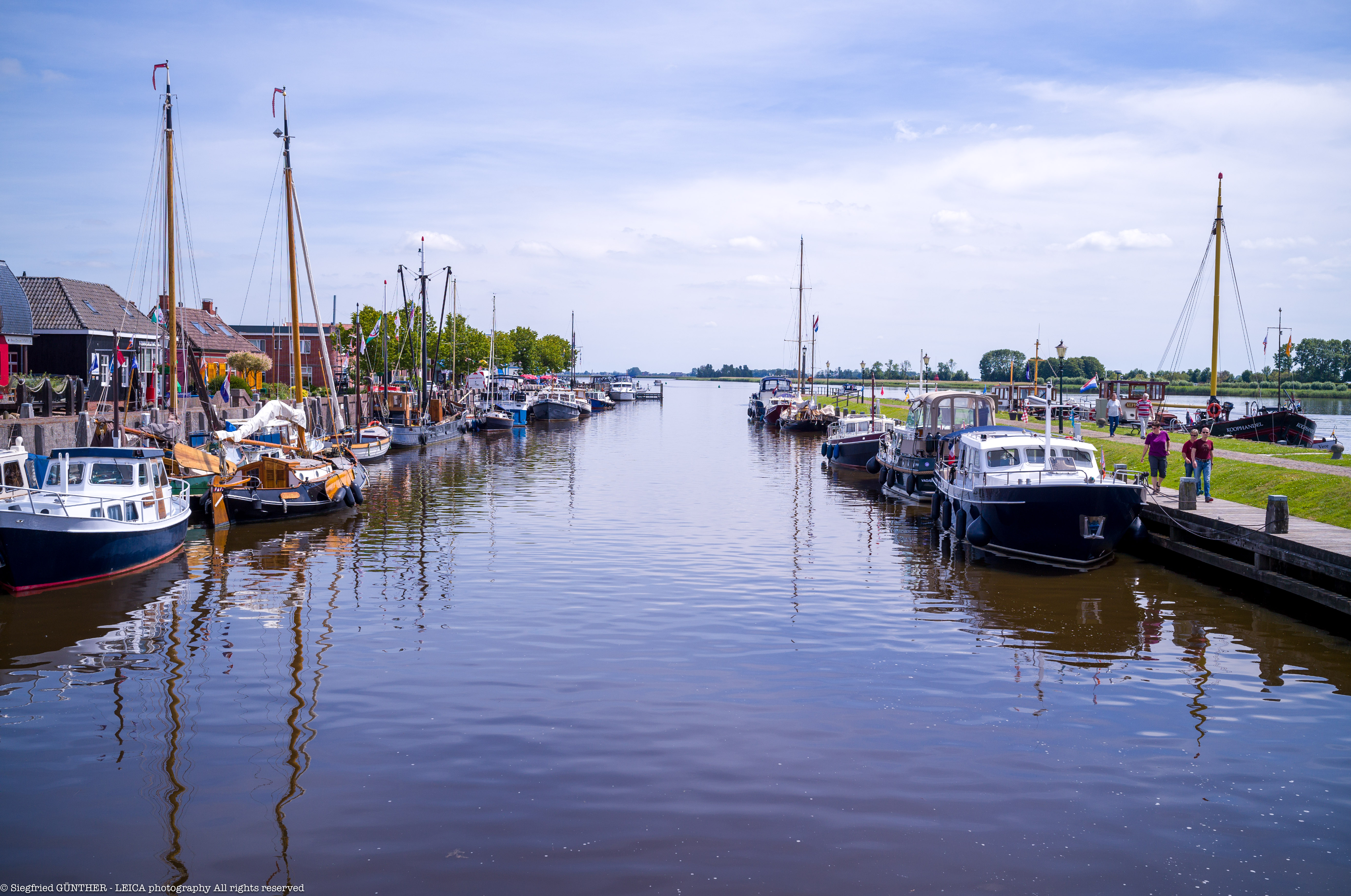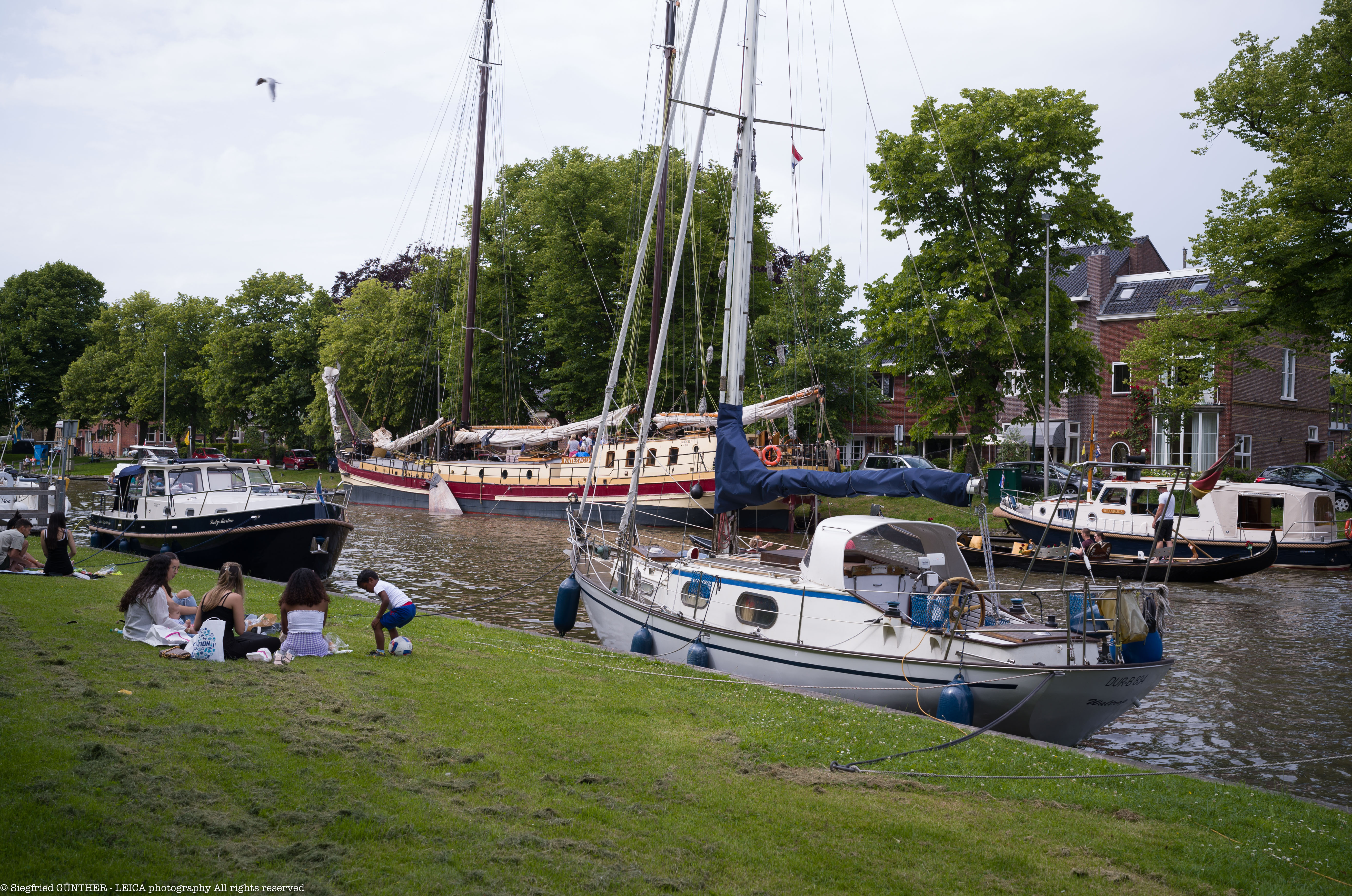 Als wir noch recht früh ankommen, ist es noch recht ruhig am Kanal, der als Passantenhafen zwischen zwei Brücken liegt . Somit ist es morgens und abends ruhig auf dem Wasser. Bei dem schönen Wetter bleiben wir allerdings nicht lange alleine. Schon am frühen Nachmittag sind kaum noch Plätze auf der Stadtseite (in Richtung Dokkum am linken Ufer) zu haben. Die schattigen Uferwiesen sind auch als Treffpunkt zum Picknicken sehr gefragt. Es herrscht Ferienatmosphäre. Wir entscheiden uns, zwei Tage in der Stadt zu bleiben, um sie besser kennenzulernen.