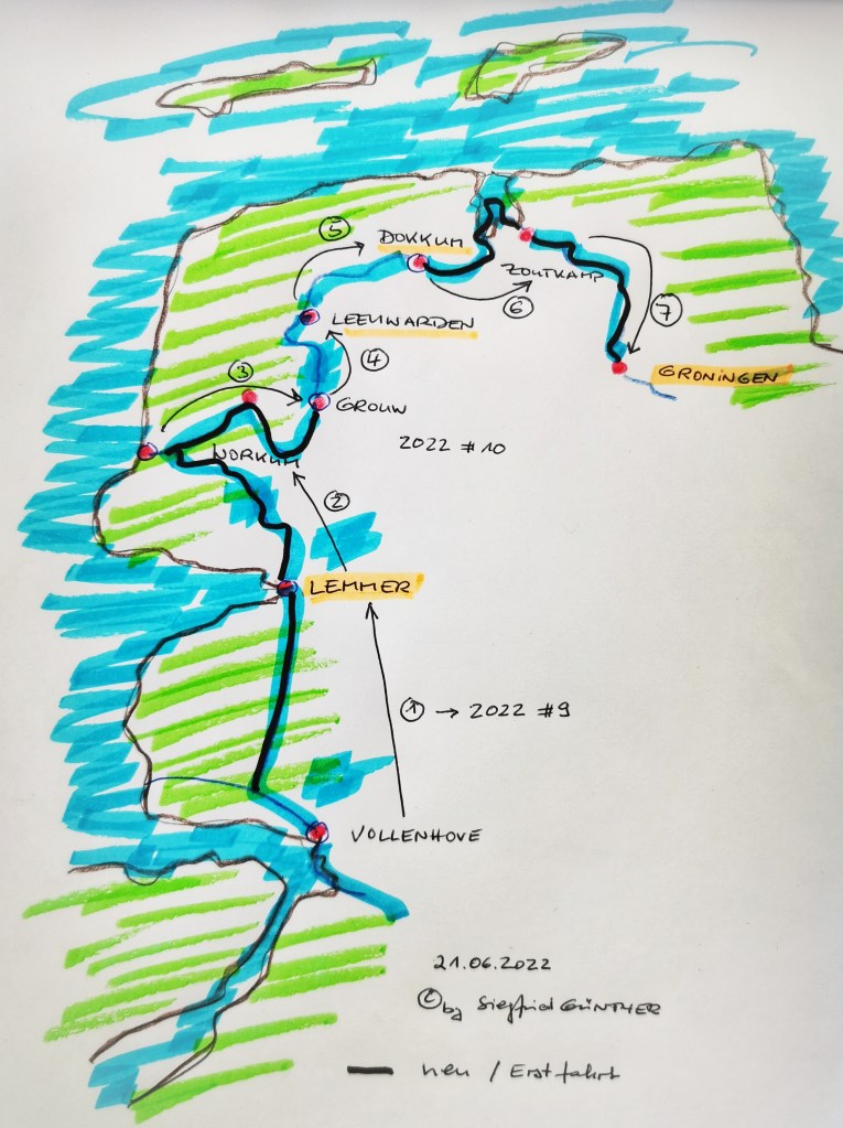 Von Lemmer aus geht es in 6 gemütlichen Tagesetappen nach Groningen. Die für uns neuen Wege sind auf der Skizze schwarz hervorgehoben. In Lemmer, Leeuwarden und Dokkum bleiben wir jeweils 2 Tage. In Groningen länger.