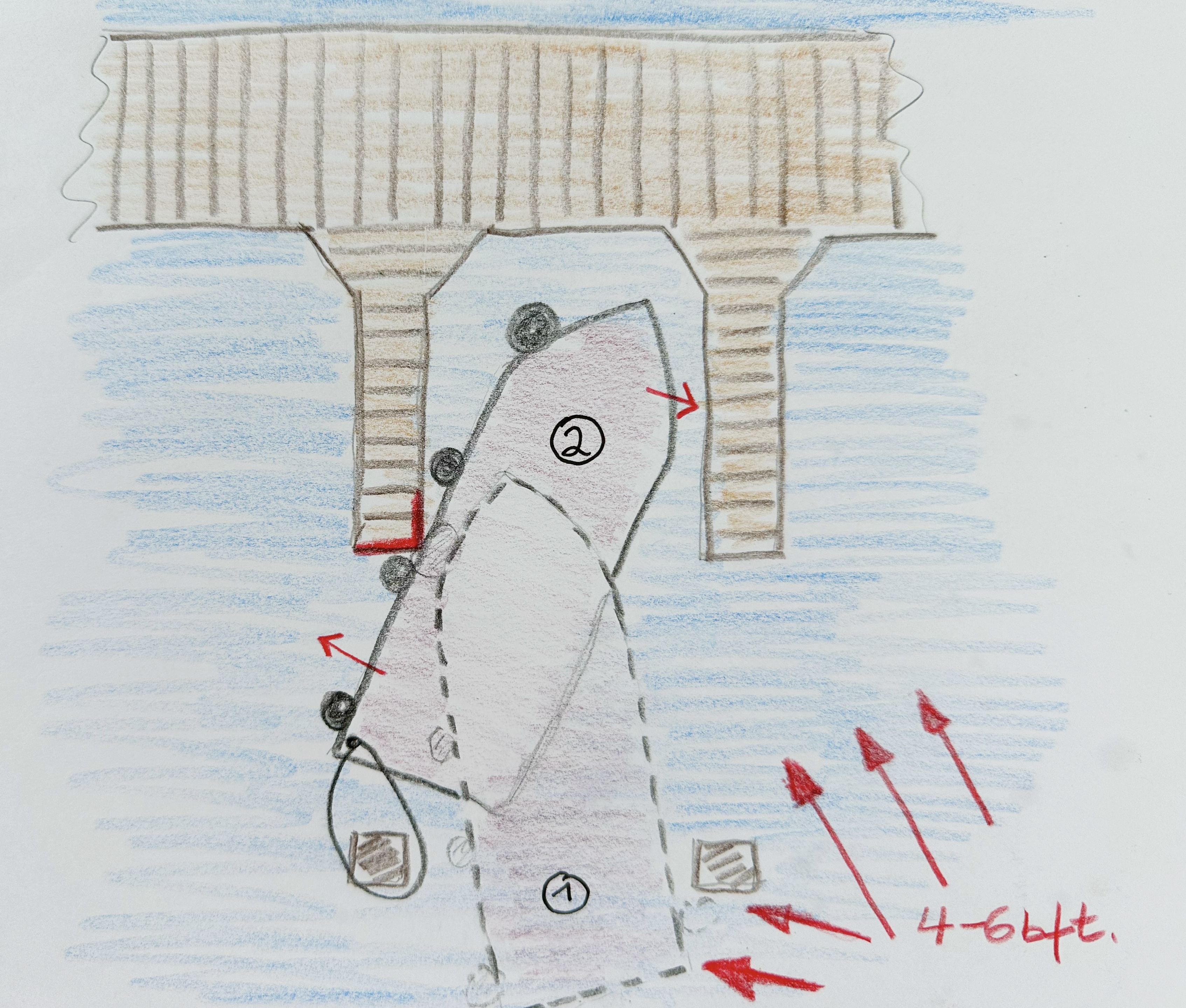 Solch eine Situation endet schnell mit ein paar Kratzern am Rumpf (2). Zumal Bug- und Heckstrahler bei Windböen über 4-5 bft sich als nutzlos erweisen (zumindest bei unserem Schiff).