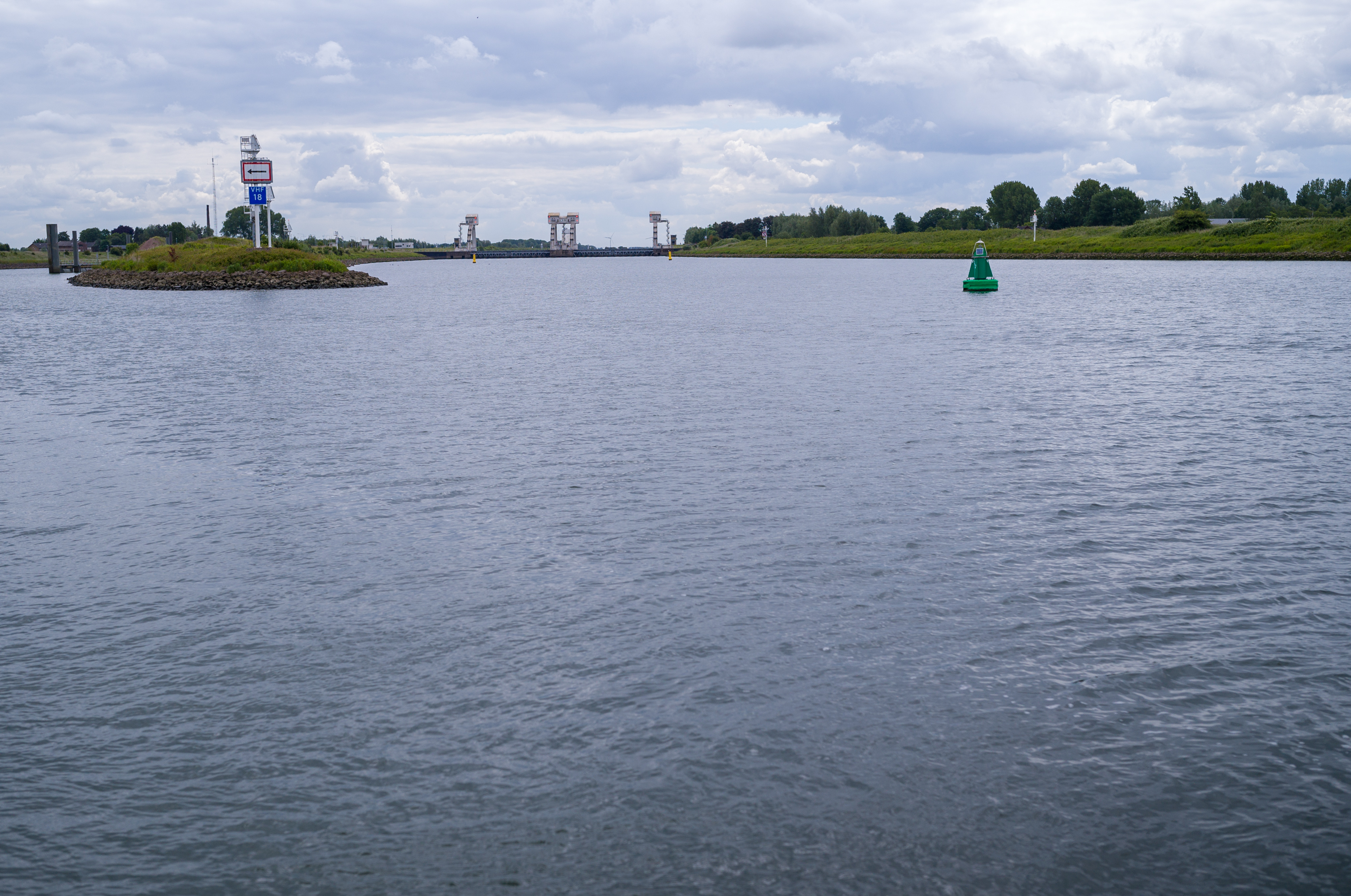 Wir fahren im Konvoi mir EPSILON, welche die Verkehrszentrale per Funk über unsere gemeinsame Fahrtrichtung informiert. Bis zur Einfahrt in den Dorsdte Kil fahren wir mit unserer üblichen Reisegewindigkeit. „SOG“ und Geschwindigkeit im Wasser liegen bei 10km/h.