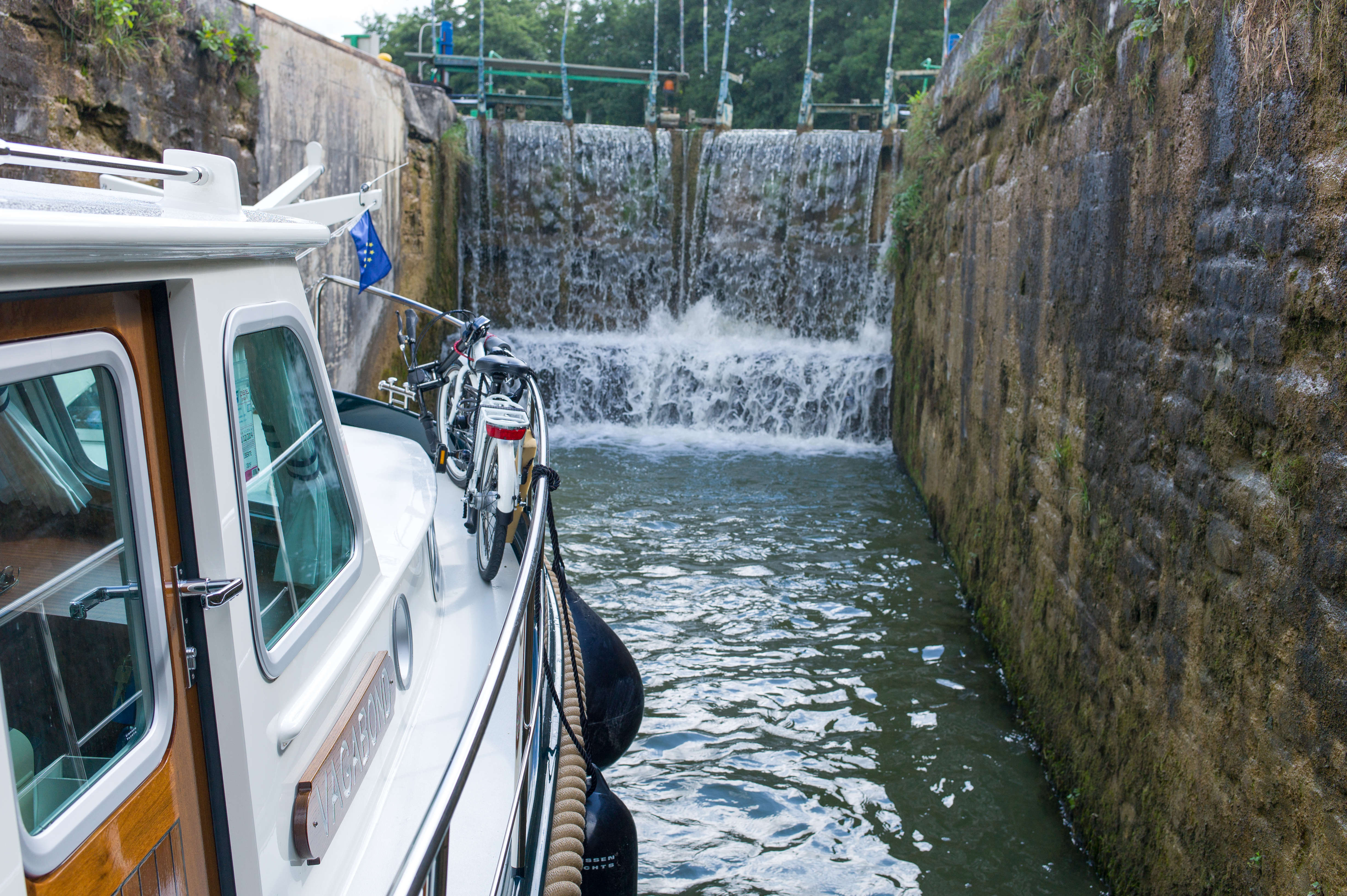 Als wir nun in die erste grosse Kammer mit einem Hub von mehr als 4m einfahren, suchen wir Festmacher, oder gar Schwimmpoller, zunรคchst vergebens. Im Vorderteil der Kammer finden wir auf der Steuerbordseite auf etwas 2m Hรถhe einen Haken. Da VAGABOND als Erster einfรคhrt, kรถnnen wir ihn zu unserem Glรผck benutzen. Fรผr BALU gibt es nichts!!!. Fรผr dieses Boot bleibt nur Motor und Buck- und Heckstrahler.