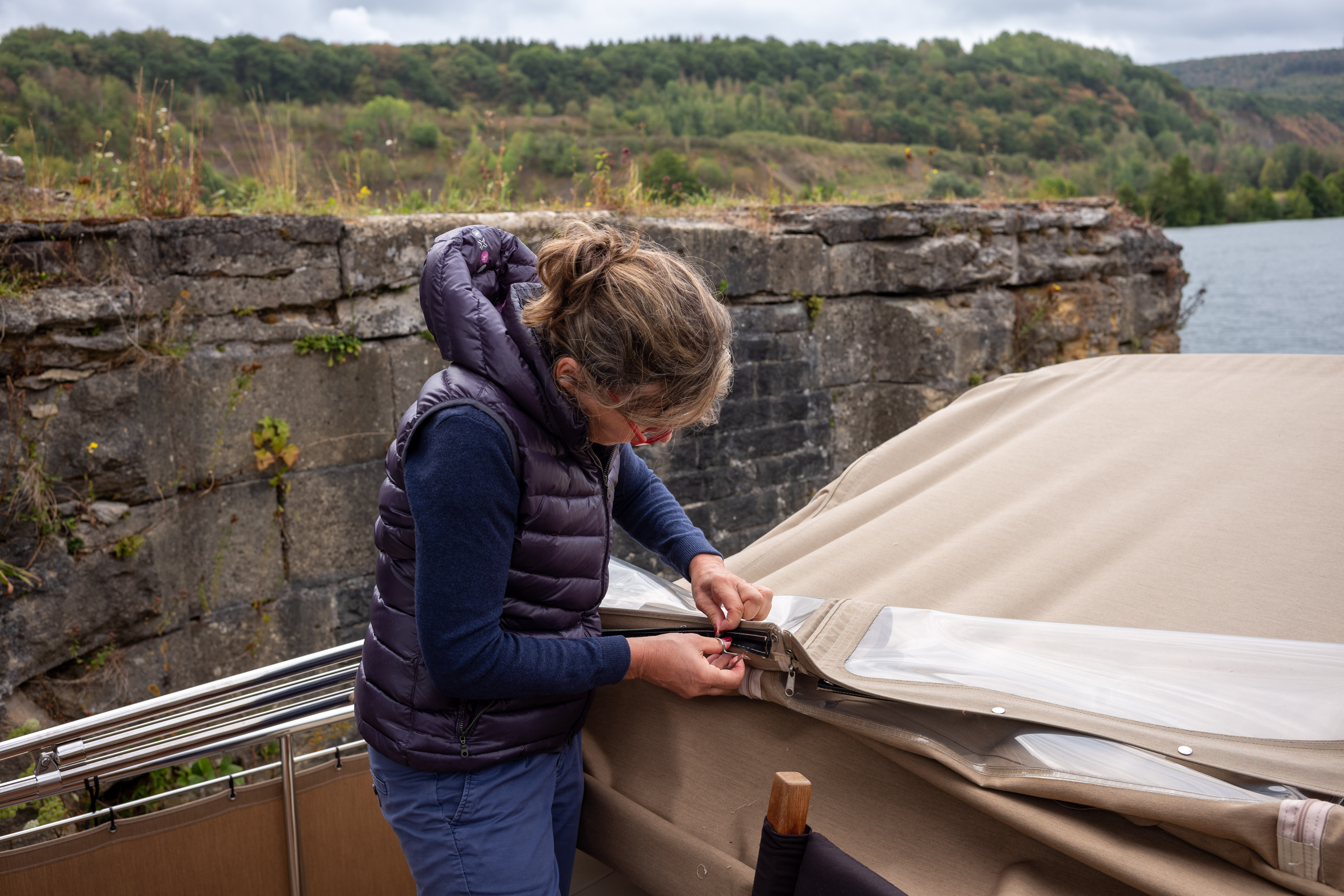 !!! Noch ein Rat aus eigener (schlechter) Erfahrung: die รผbliche Durchfahrthรถhe von 3,50m ist auf dem Ardennen-Kanal nicht garantiert. Es sind eher 3,45m… Wir haben es einmal ohne vorsorglich gelegten Cabrio versucht….. Gleich in der ersten Schleuse nach Le Chesne blieben wir beim Ausfahren unter der Brรผcke hรคngen. Nach dem ersten รrger und dem รผblichen „Es hรคtte auch schlimmer kommen kรถnnen…, hat „Powertap“ dann fรผr den Rest der Reise sehr gute Dienste geleistet (siehe Bild).