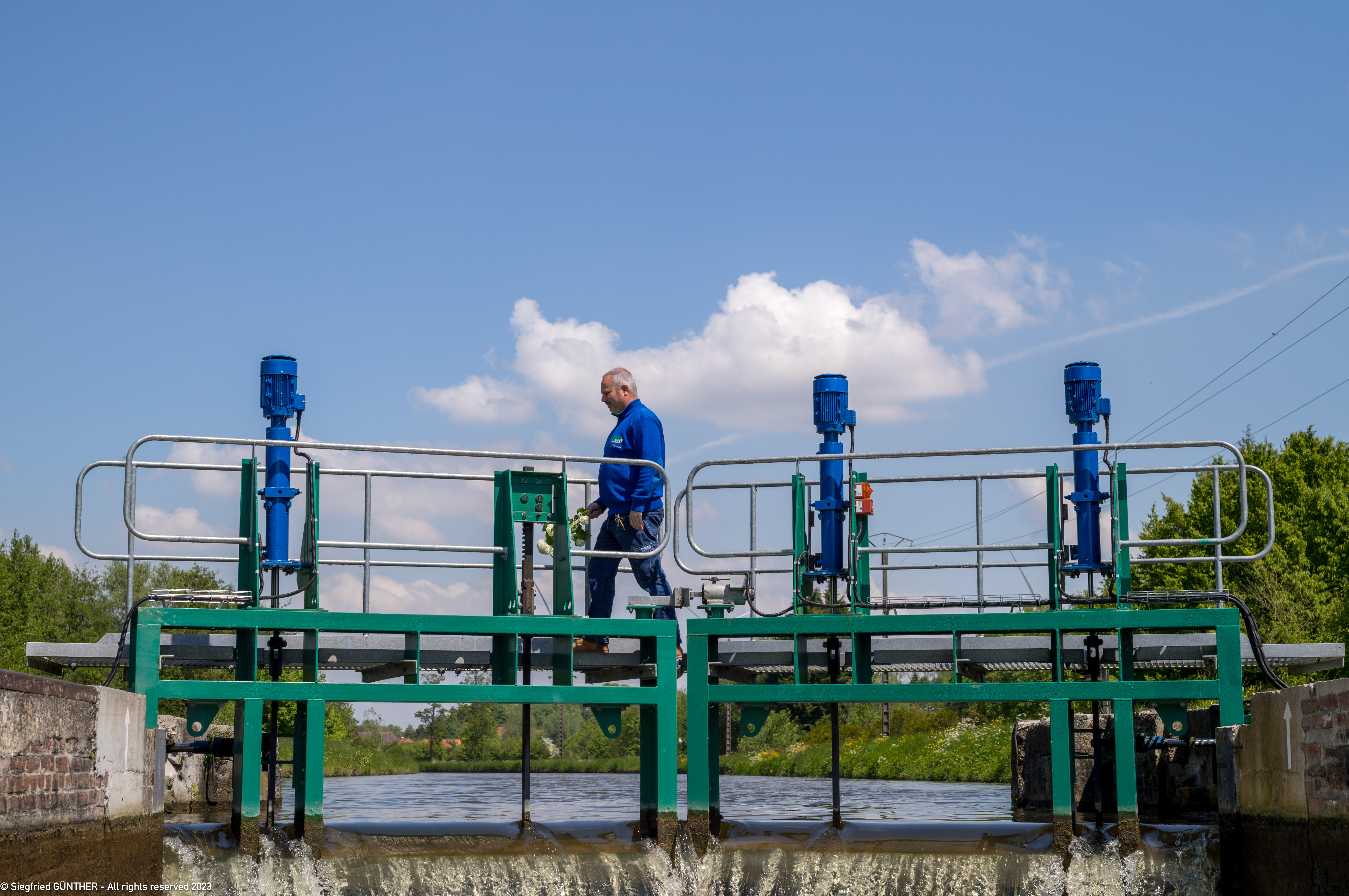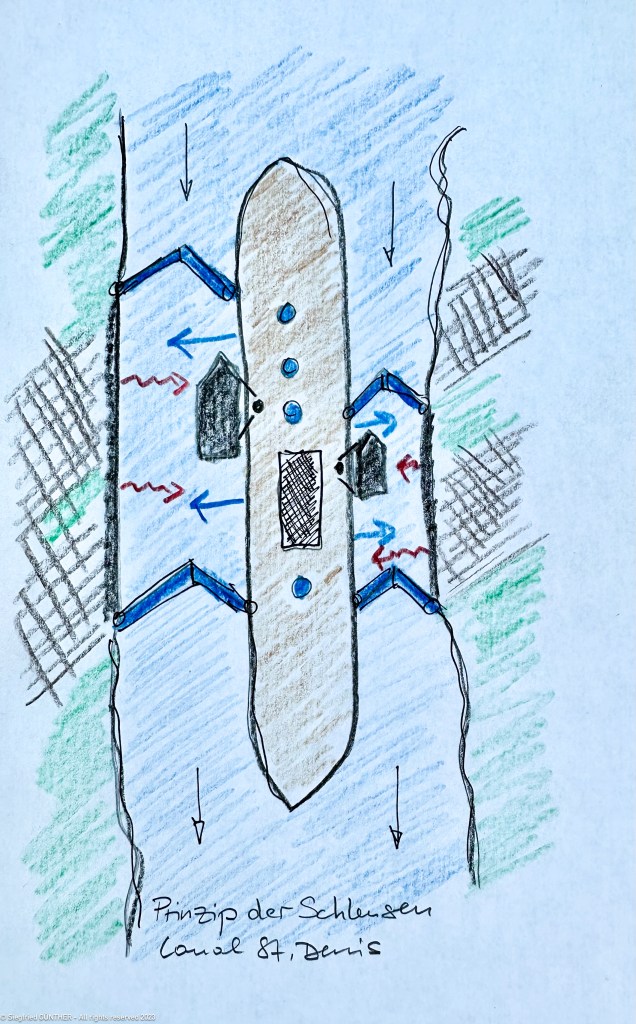 Bei allen Schleusen des Canal Saint Denis wird das Wasser immer von der Mitte aus (zwischen den beiden Kammern) von unten in die jeweilige Kammer gepumpt.