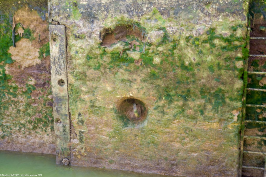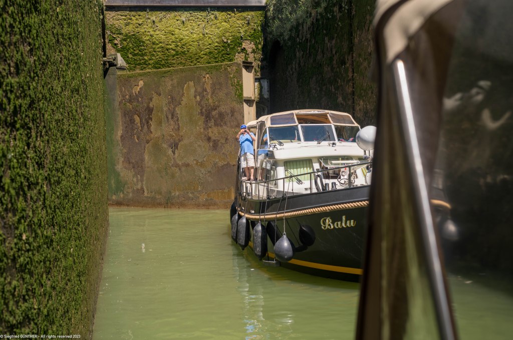 In der letzten Schleuse vor der Mรผndung des Loing, wird es dann noch einmal richtig eng. Ein Frachter und ein Schubschiff teilen sich die Schleuse mit uns. BALU bittet den Frachter, seine Schraube zu stoppen, was er zunรคchst einfach รผberhรถrt, bis die Schleusenwรคrterin einschreitet.