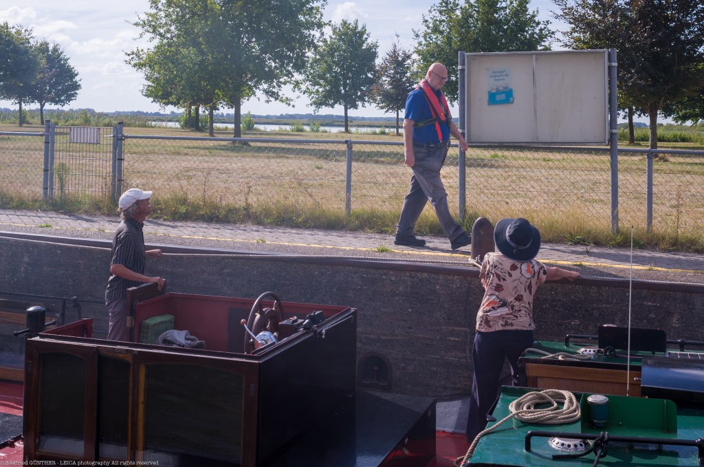 Am nächsten Tag geht es weiter nach Spakenburg. Wir verlassen den Hafen mit 4 Schiffen um 8h. Nach 1h30 erreichen wir die Schleuse Nijkerk. Dort herrscht grosses Gedränge. Der Schleusenwärter kommt zur Schleusenkammer, um etwas Ordnung zu schaffen. Nach 30′ verlassen wir mit neun Schiffen die Schleuse.