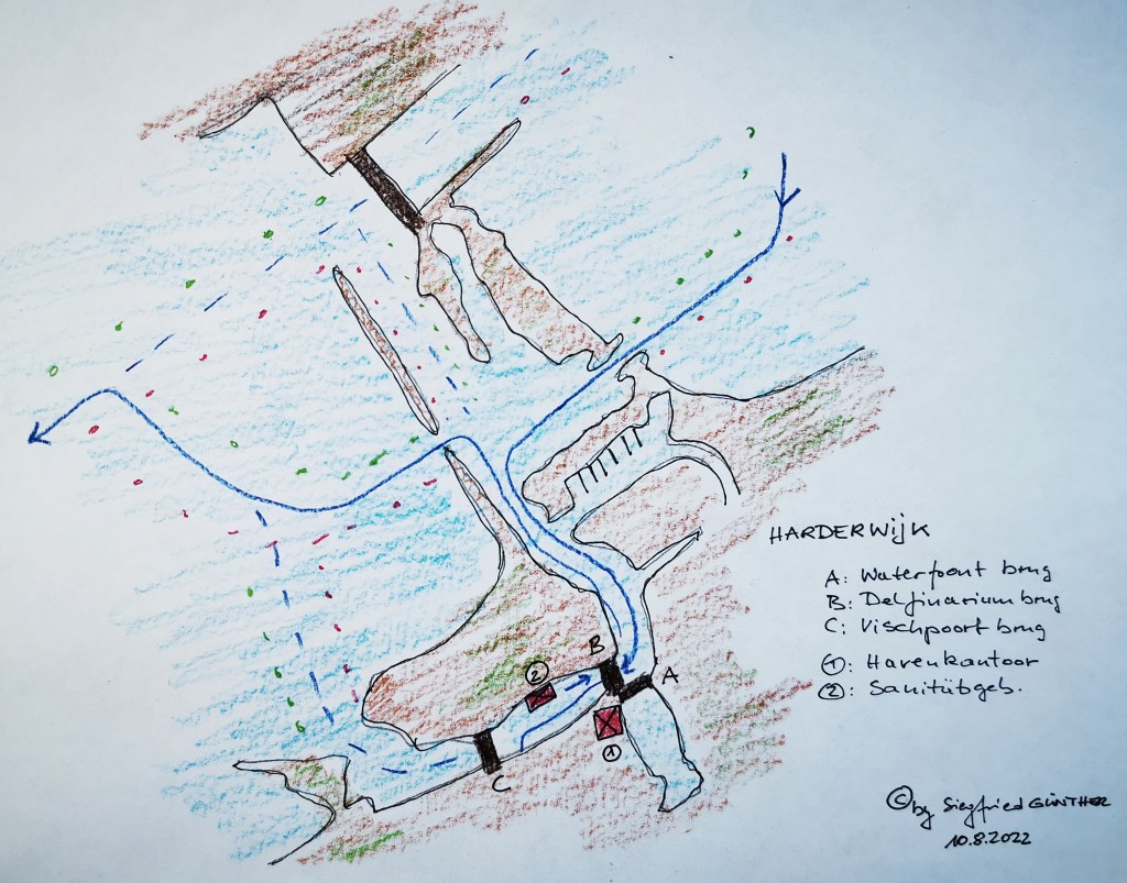 Am schönsten und ruhigsten liegt man im Becken hinter der Waterfrontbrug. Dort befindet sich auch der neue Havenkantoor (1) inklusive Waschräume. Als wir ankommen, sind dort alle Plätze schon belegt. Die Delfinariumbrug (B) wird gerade gehoben. Wir nutzen die Gelegenheit und fahren zum anderen Hafenbecken in Richtung Vischpoort Brücke (C). Auch hier liegen die Boote schon zu einem erheblichen Teil im Doppelpack. Trotzdem finden noch ein kleines „Loch“, den letzten freien Platz. Das Anlegen verlangt diesmal Millimeterarbeit. Es ist windstill , wir nehmen uns Zeit. Nach einigem Hin- und Her und der Hilfe des Eigners vor unserem Bug liegen wir nun sicher in der Lücke (siehe Bild).