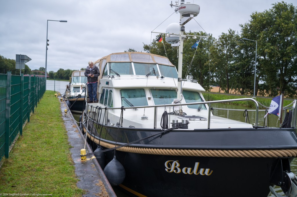 Das ändert sich aber als wir um 11h30 die Schleuse Gleesen erreichen. Der Schleusenwärter teilt uns einfach mit, dass wir im Unterwasser warten sollen, „bis er uns aufruft„. Hier gibt es einen Wartesteg. Er bietet einem Sportboot Platz. So legen wir uns in Doppelpack mit BALU und warten bei strömendem Regen. Kurz vor 13h ist es dann soweit. Inzwischen ist der Regen noch stärker geworden. Aber wir haben keine Wahl. Jetzt heisst es weiterkommen.