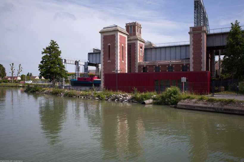 Wir nutzen den Nachmittag zu einem Besuch des ehemaligen Schiffshebewerks „Fontinettes“. Das Hebewerk mit Freycinet-Massen (38,50×5,05) aus dem Jahre 1888 ersetzte eine Schleusentreppe von 5 Schleusen. 1967 wurde es durch eine grosse Schleuse im Europa-Format (144×12) ersetzt. Die Dauer des Schleusens ist zwar ähnlich, allerdings können 6 traditionelle Péniches gleichzeitig geschleust werden. Das war zumindest bis in die 80ger Jahre so. Heutzutage verkehren hier grössere Kähne. In den nächsten Jahren soll eine zweite Kammer die Schleuse ergänzen.