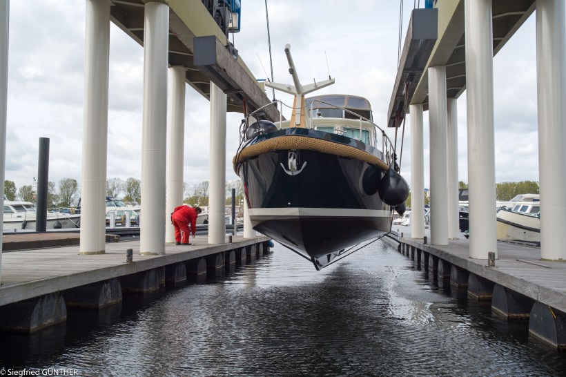 Bevor das Boot mit dem Hebekran aus dem Wasser gehoben wird, wird es zunächst „Winterfertig“ gemacht: Voll tanken, Motorinspektion, Abwasser ablassen und Tank spülen, Frischwasser ablassen und Rohrsystem leer blasen, Frostschutz,…